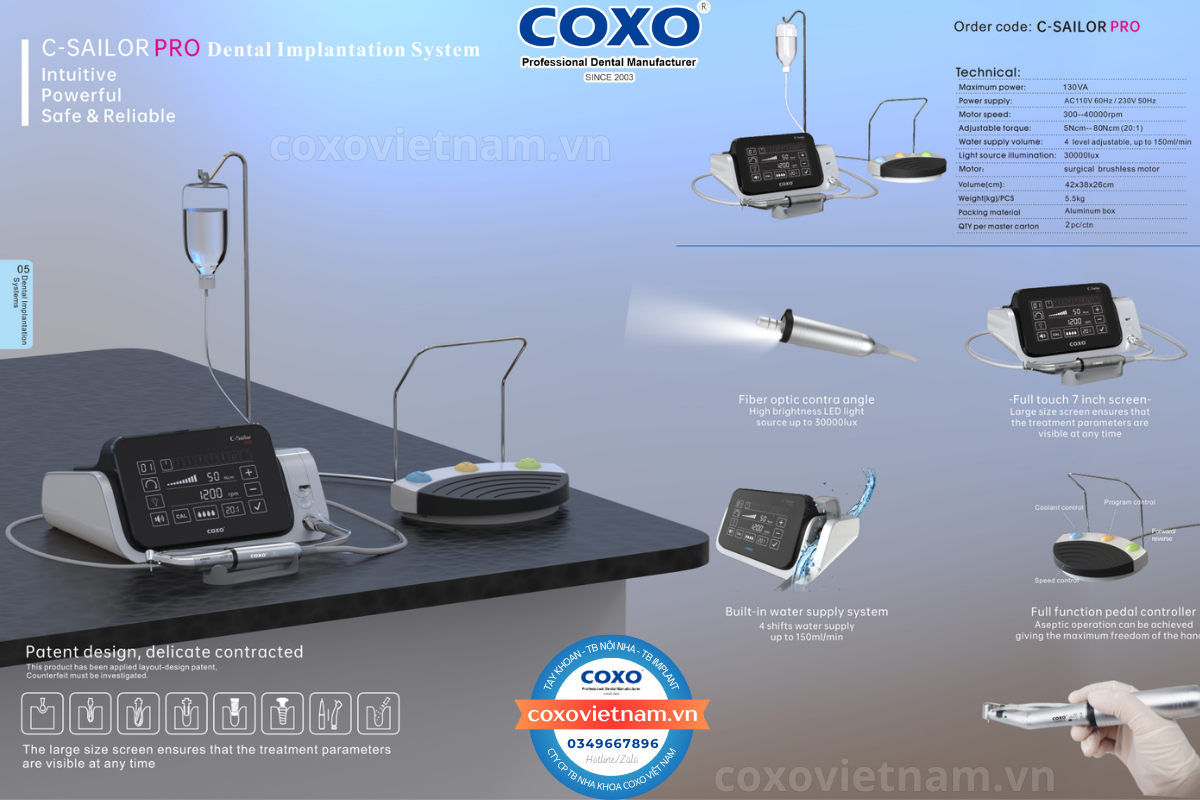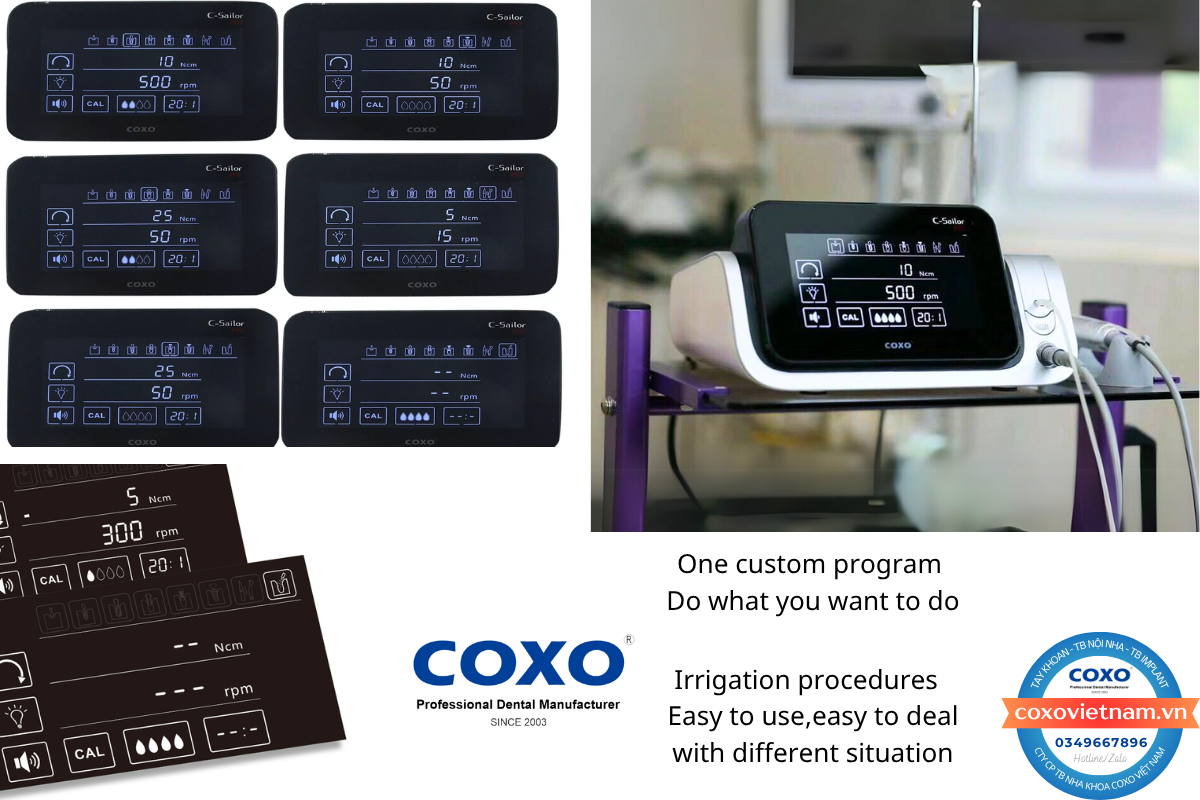 COXO C-Sailor Pro là một thiết bị đa năng thực thụ. Với nhiều chương trình cài đặt sẵn và khả năng tùy chỉnh linh hoạt, máy hoàn toàn đáp ứng được yêu cầu đa dạng của các quy trình phẫu thuật và loại hình implant khác nhau. Quan trọng hơn cả, các tính năng bảo vệ tích hợp như chống quá nhiệt và quá tải hoạt động như một người vệ sĩ thầm lặng, đảm bảo an toàn cho bệnh nhân và bảo vệ thiết bị khỏi những hư hỏng không đáng có, giúp máy hoạt động bền bỉ và ổn định.